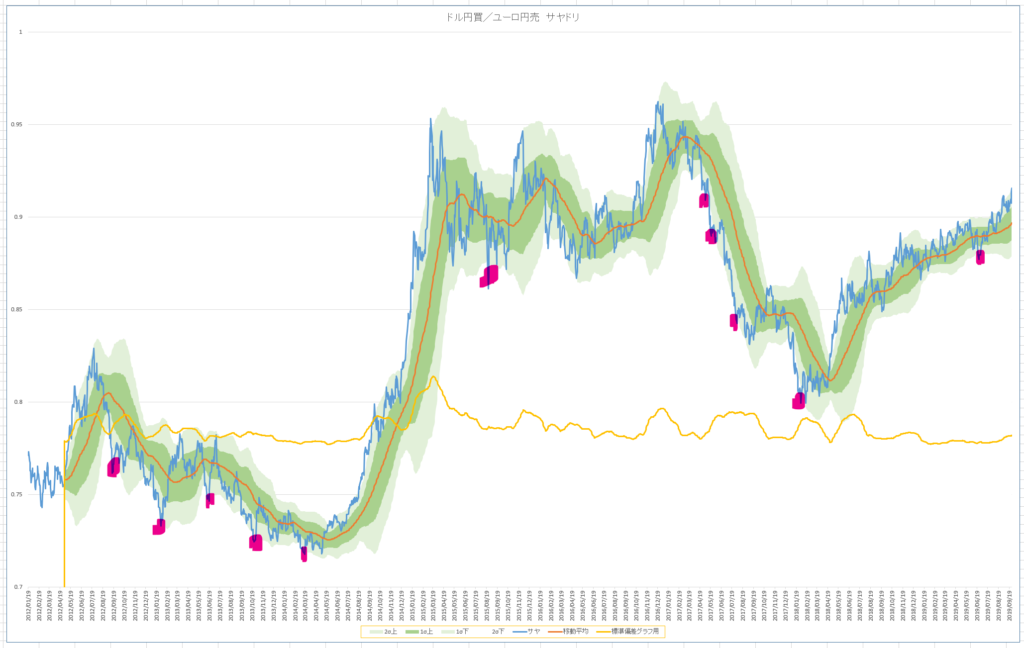 ピンクっぽいマーカーの時に、ドルエン買/ユーロ円売エントリーし、少額づつナンピン買いしていく作戦だ。