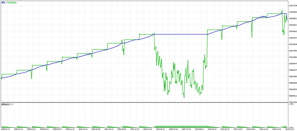 あれから、MT5で2000年くらいから、バックテストをしてみたところ、全然ダメ。ものすごく含み損に耐えれば、何とか復活して、最終的には同じくらいの益になるんだけど、とても100万では、含み損に耐えられぬ。
