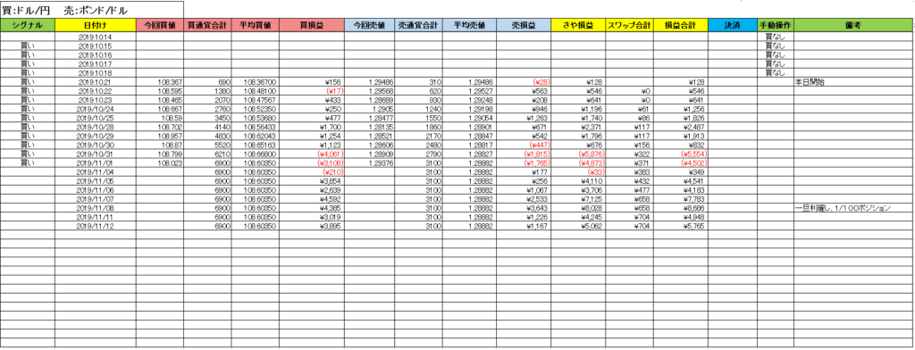 サヤ取りツールの計算ではこんな感じである。実際に始値でエントリーとかしていないので、ずれもある。