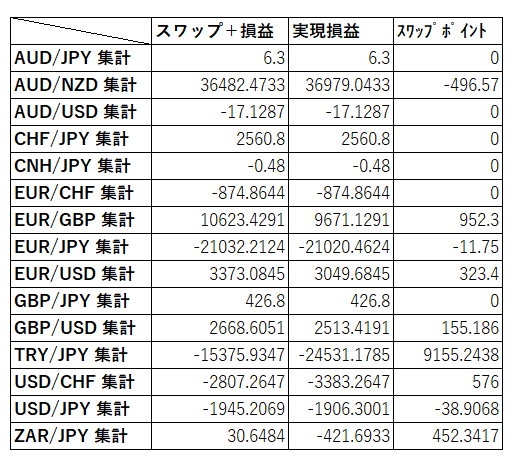通貨別に集計してみた トルコリラやらなかったら良かったー。でも、持ち続けていたらプラスになっていたかも。でも、なんかやだからいいや。 トルコリラ のチャートもう見たくないし。AUDNZDは優秀である。あの作戦のおかげだ。あとは、だいたいサヤ取りのペアなので、なんとも言えない。
