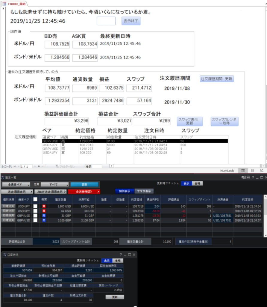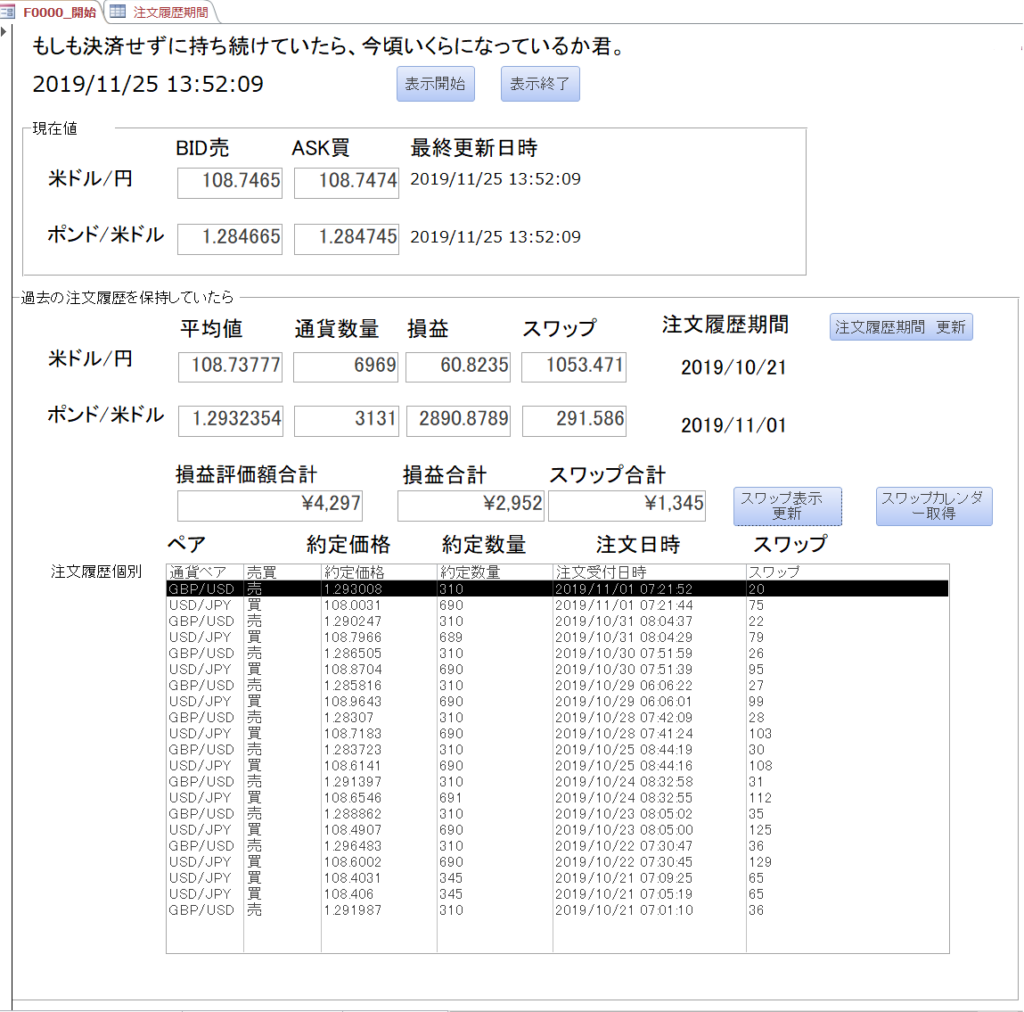 現在のポジションを表示して、SBIのアプリと比べてみた。よく見ると、スワップ合計が1円、損益合計が4円ずれているけど、それは、誤差なのでどうでもいい。