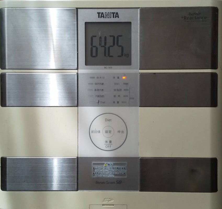 ちなみに、体重計は、TANITAの体重計。酔っ払って液晶部分踏んで割れていたり、なにか板状のもの落として、角あたって、右下の銀の部分ちょっと凹んでるけどちゃんと動いている。ちなみに表示している体重は、乳酸飲料とコーヒーを飲んでいるので、ちょっと多い。記録する体重は、毎朝トイレに行ったあとに、寒くてもシャツとパンツ姿で測っている。