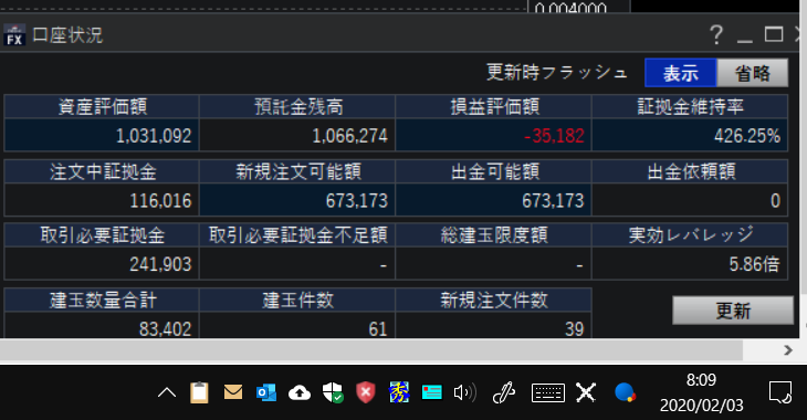 資産評価額 : 1031092 、 預託金残高 : 1066274 、 損益評価額 : – 35182 。 預託金残高 は前日比+718 円。