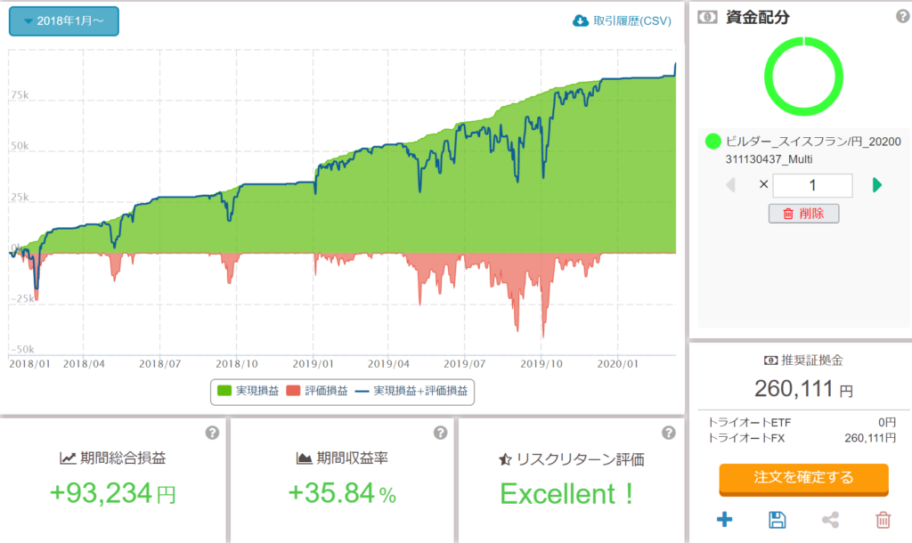 また、スイスフラン/円で、作ってみたのだが、収益率よりもドローダウンが小さくなるようにしている。これをもとに、利確幅をもうちょっと変えて試してみようと思っている